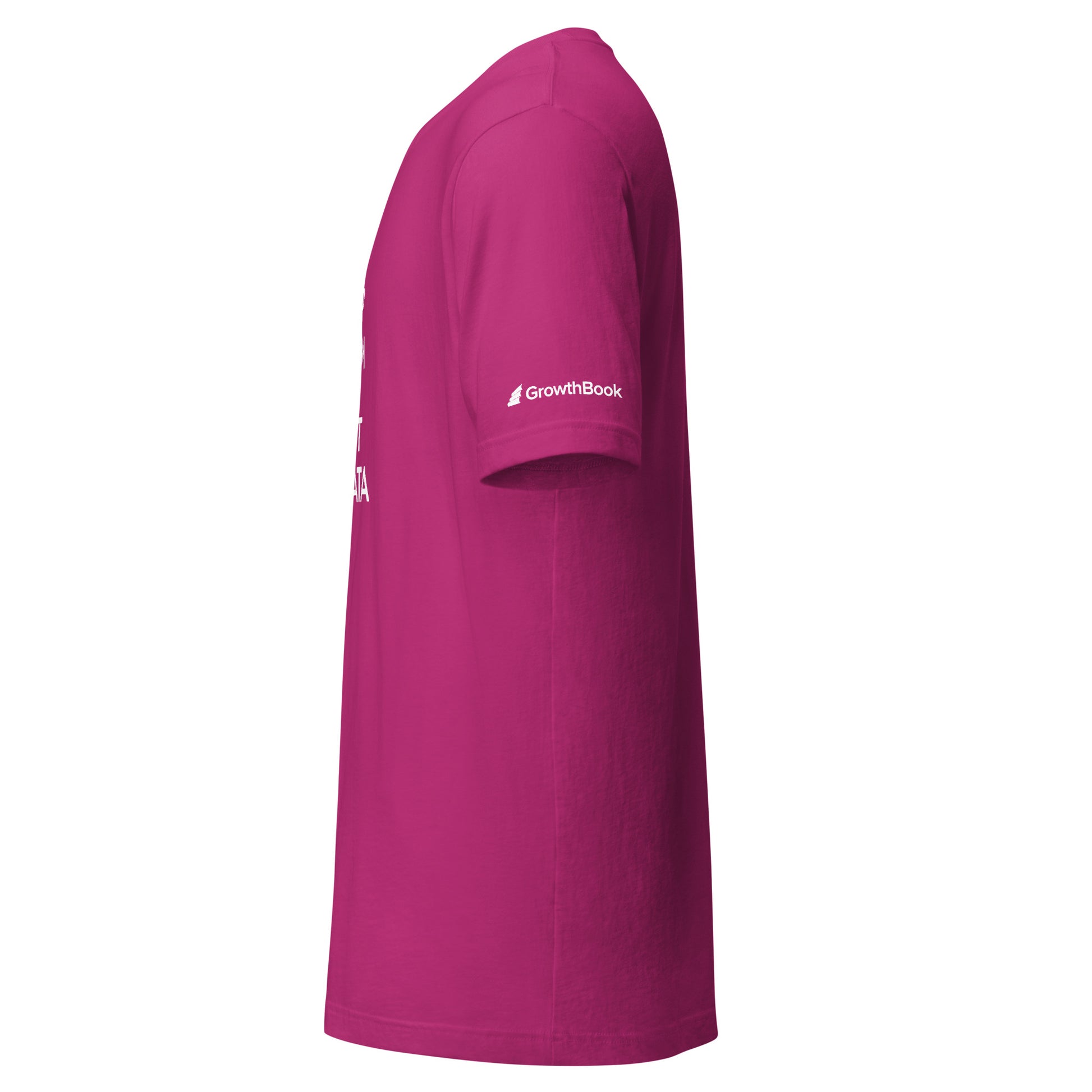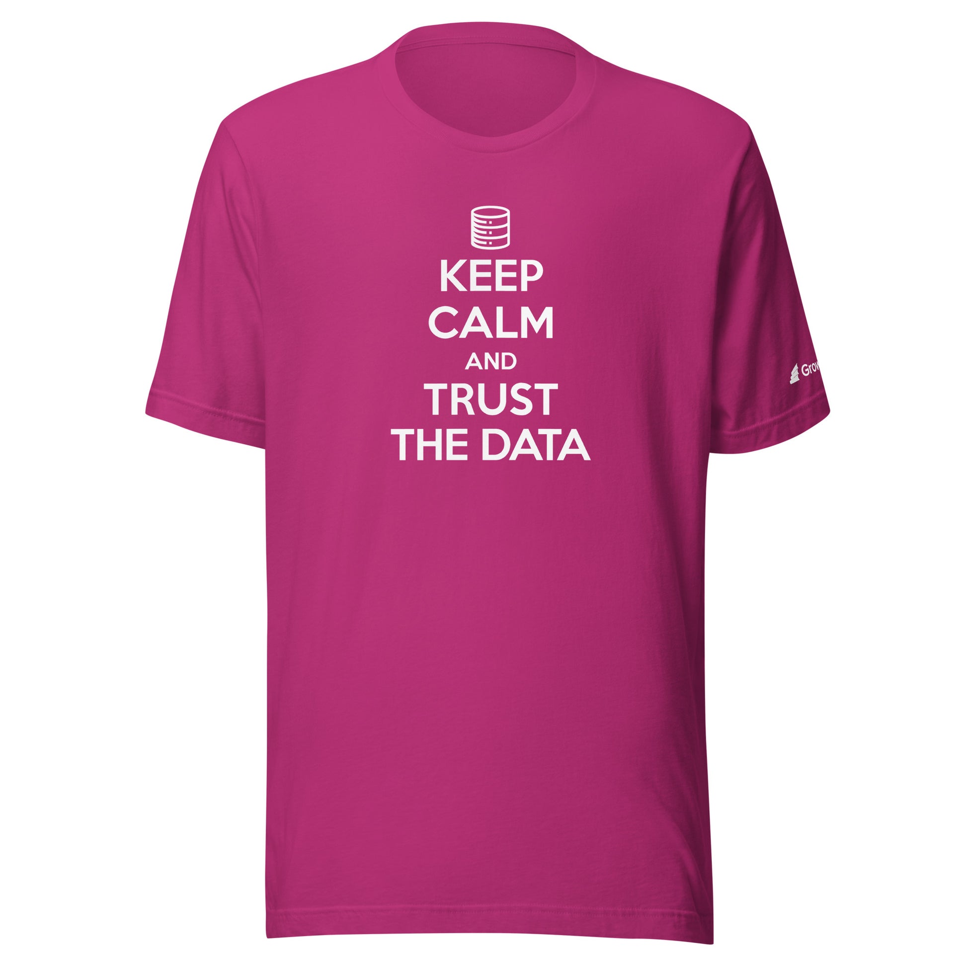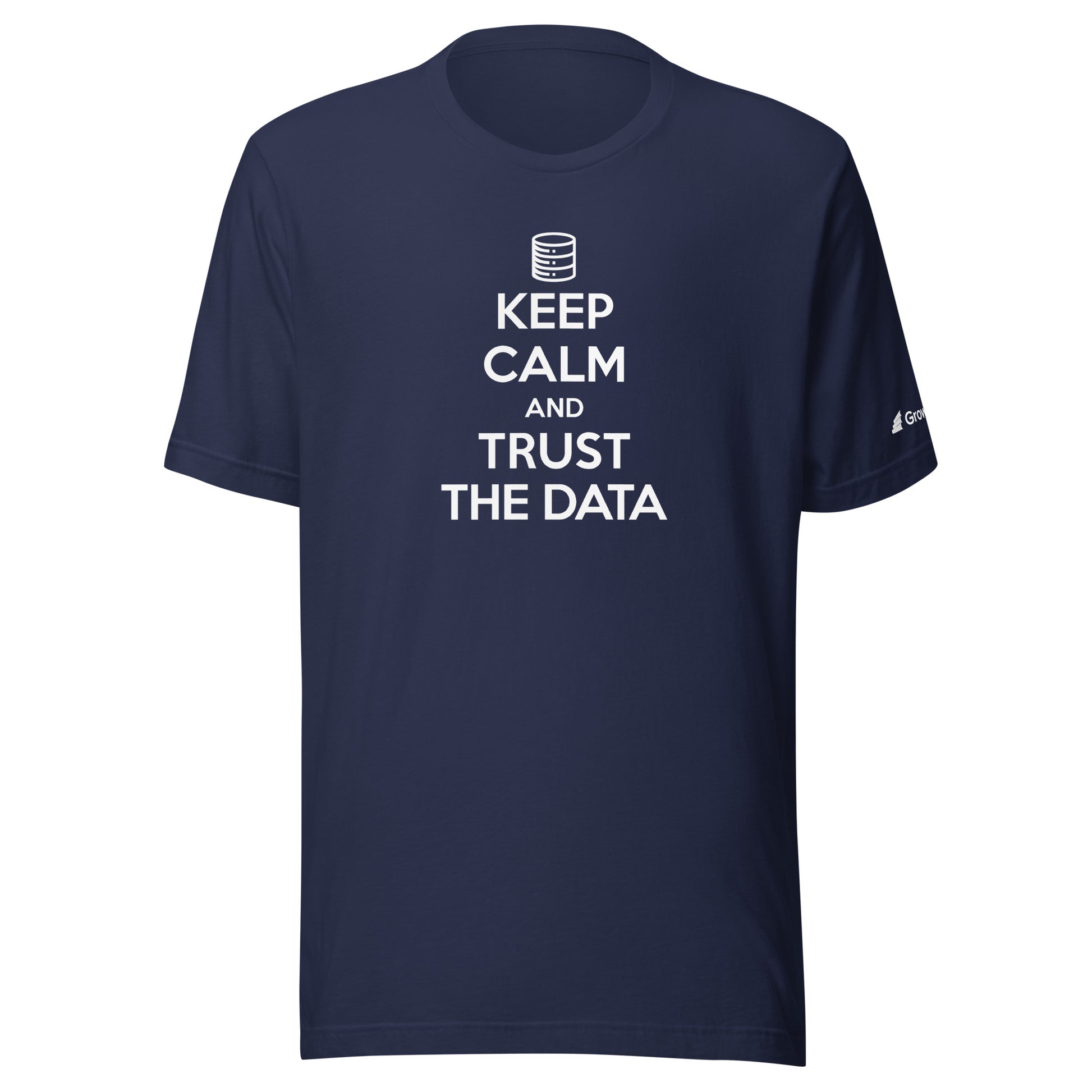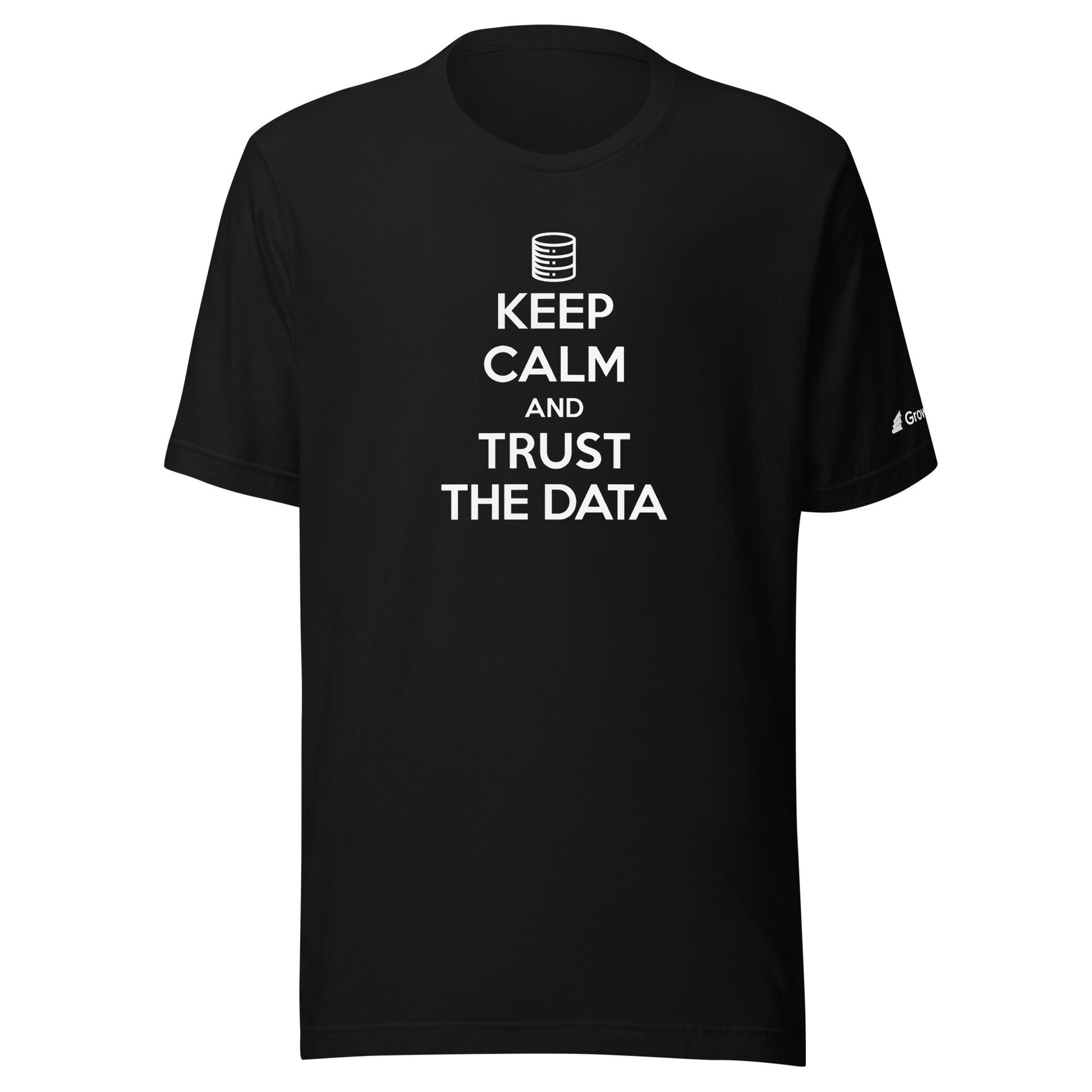 Keep Calm and Trust Data Unisex t-shirt, GrowthBook logo on the left sleeve.